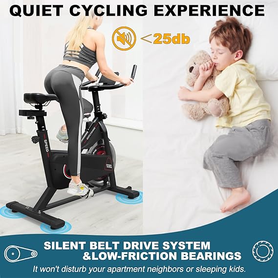 - đ´ăSMOOTH & SILENTă Equipped with a silent belt drive system and heavy flywheel, this stationary bike ensures a smooth and quiet indoor cycling experience.