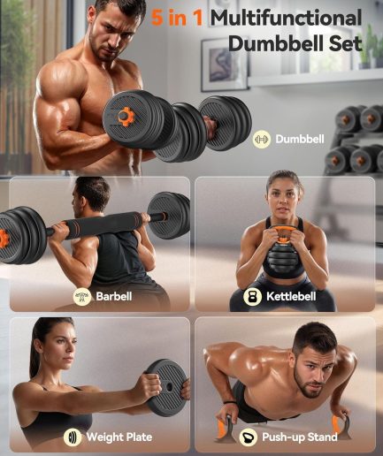 • FEIERDUN Adjustable Dumbbells, 20/30/40/45/70/90lbs Free Weight Set with Connector, 5 in1 Dumbbells Set Used as Barbell, Kettlebells, Push up Stand